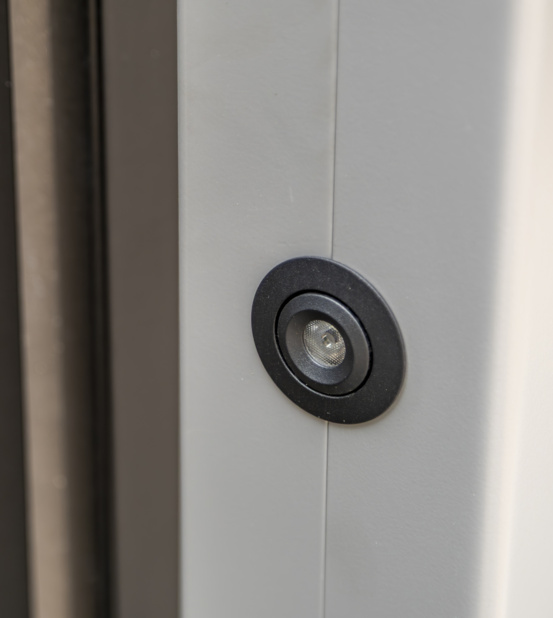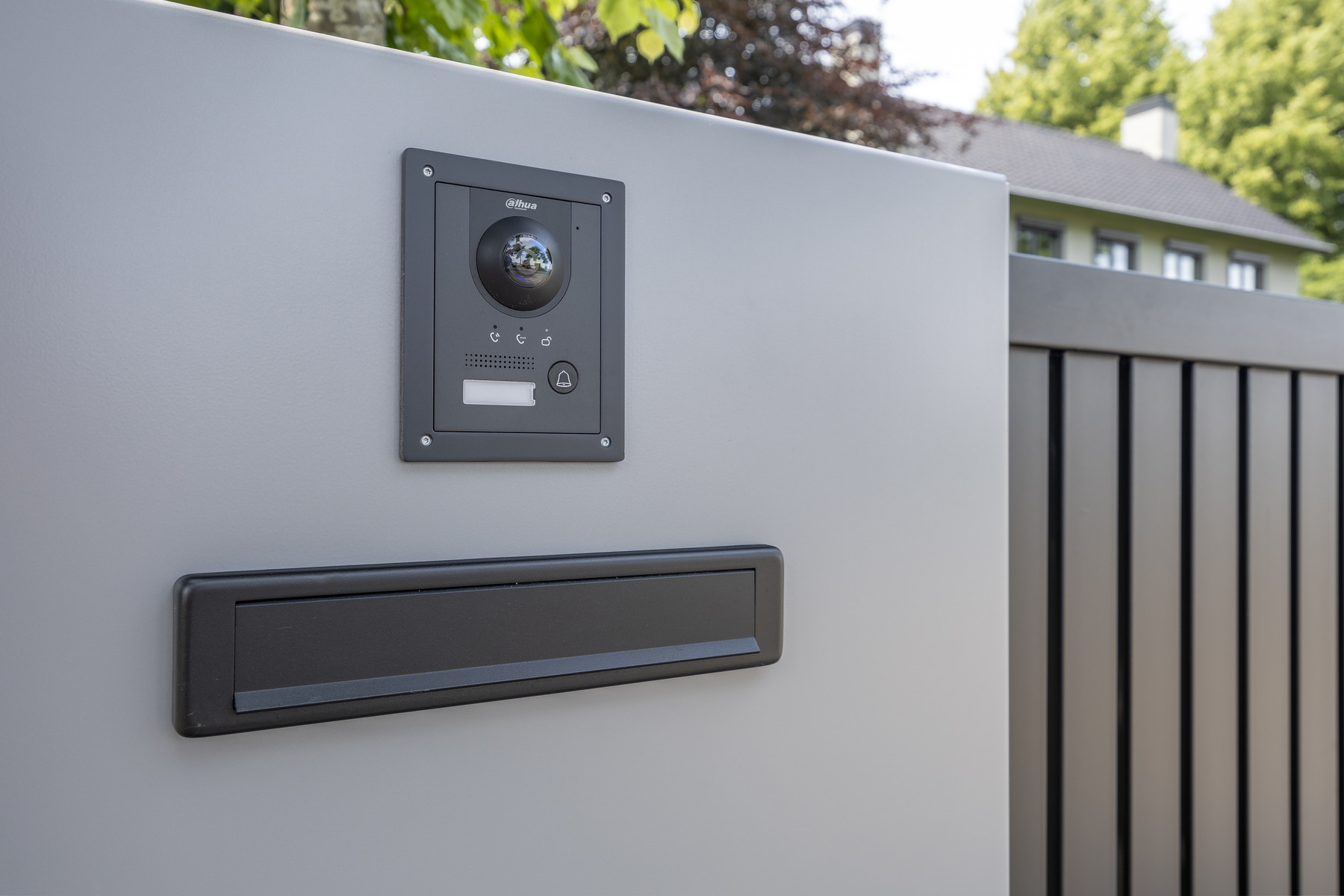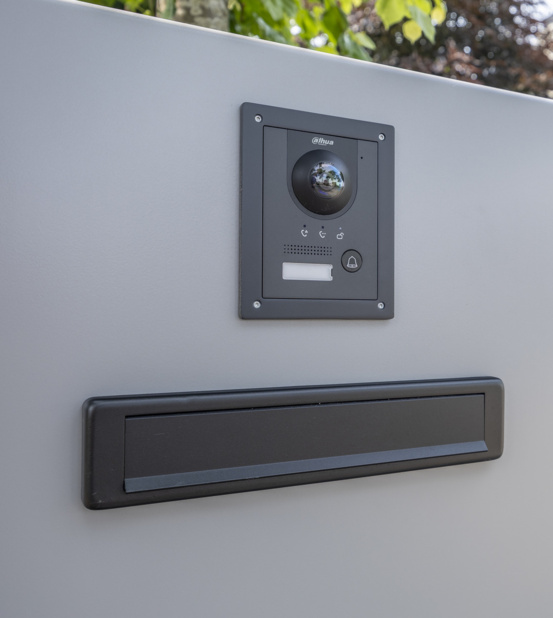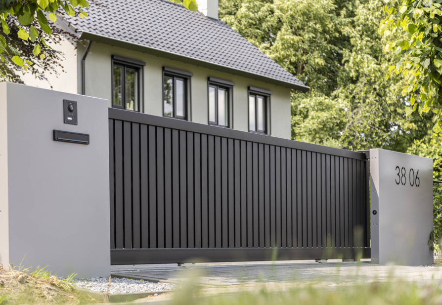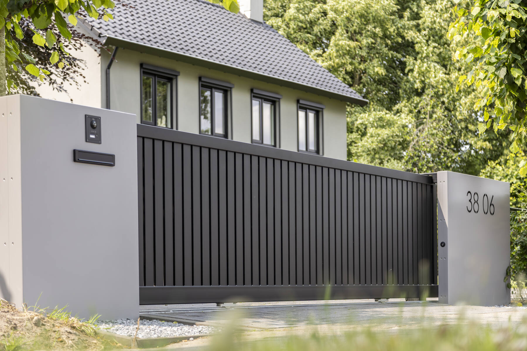 Een eyecatcher! Dat is deze elektrische schuifpoort, gecombineerd met gepersonaliseerde panelen. Deze maatwerk toegangspoort is voorzien van een geïntegreerde schuifpoortaandrijving, een brievenbus, verlichting en een naadloos geïntegreerd intercomsysteem. In het rechterpaneel is het huisnummer uitgelaserd. De toegepaste schemerschakelaar zorgt ervoor dat de het huisnummer subtiel wordt uitgelicht als de avond valt.
