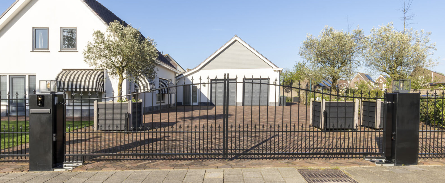 Een perceel in stijl afscheiden, dat is hier goed gelukt. Bij deze woning in Well is model Mexico toegepast, als draai- en looppoort en bijbehorend sierhekwerk. De XXL-palen geeft de poort een extra robuuste uitstraling.