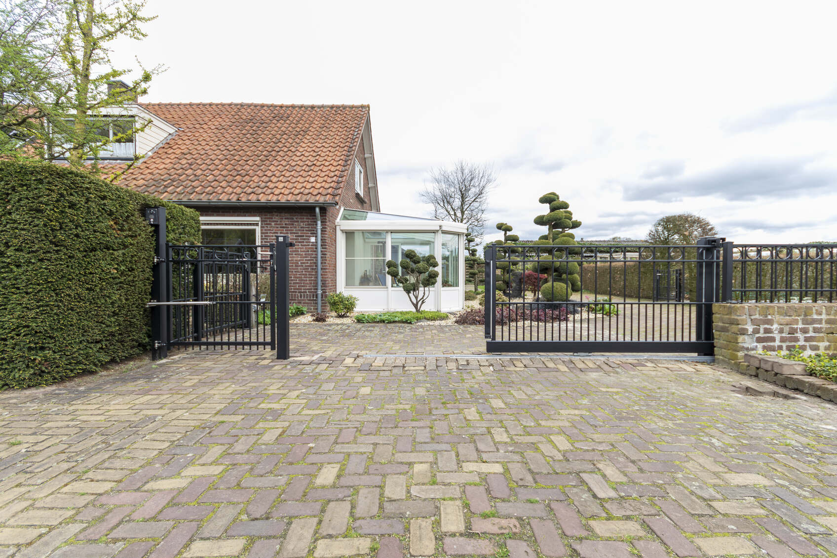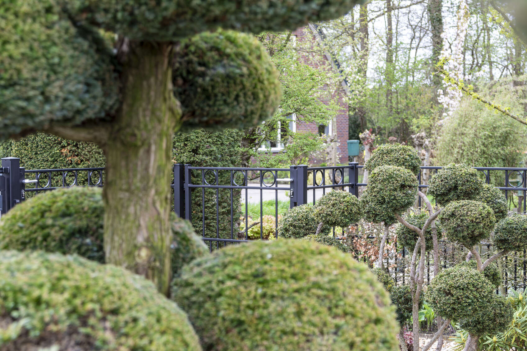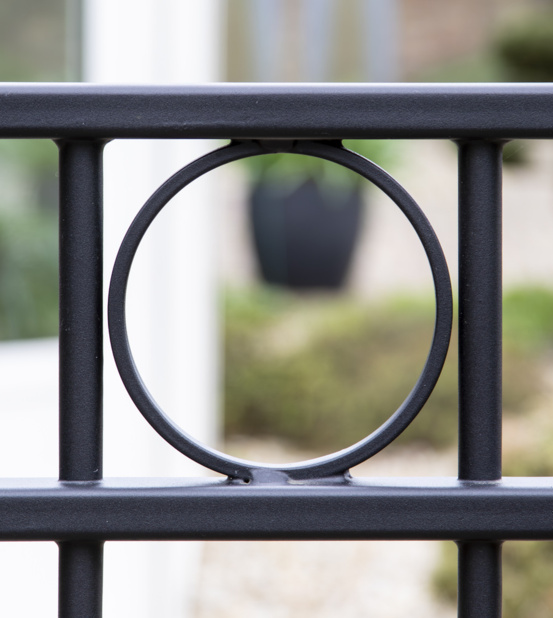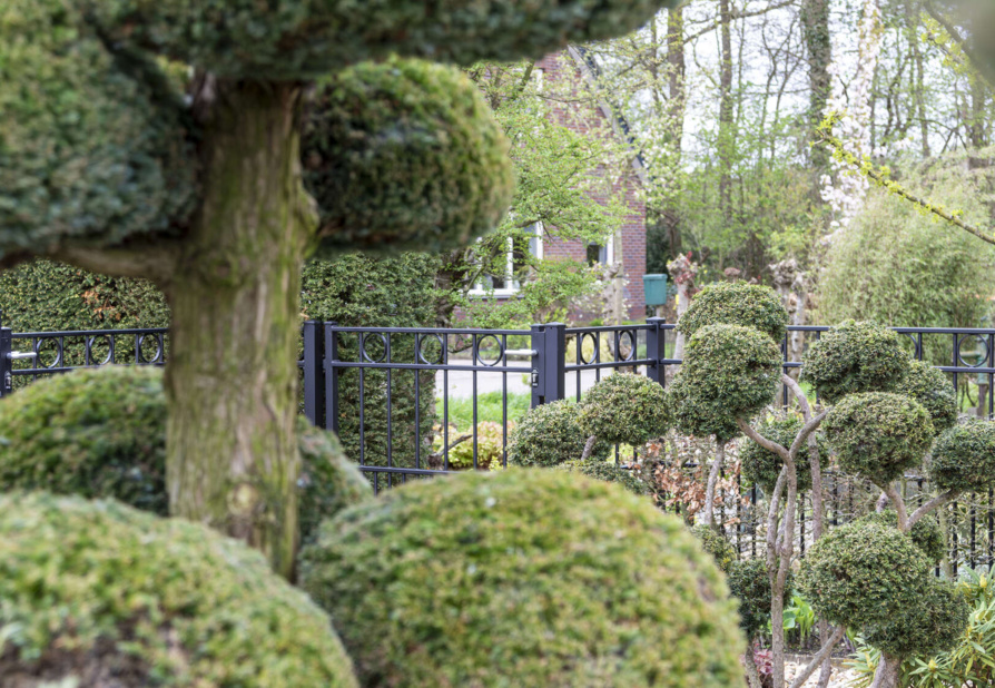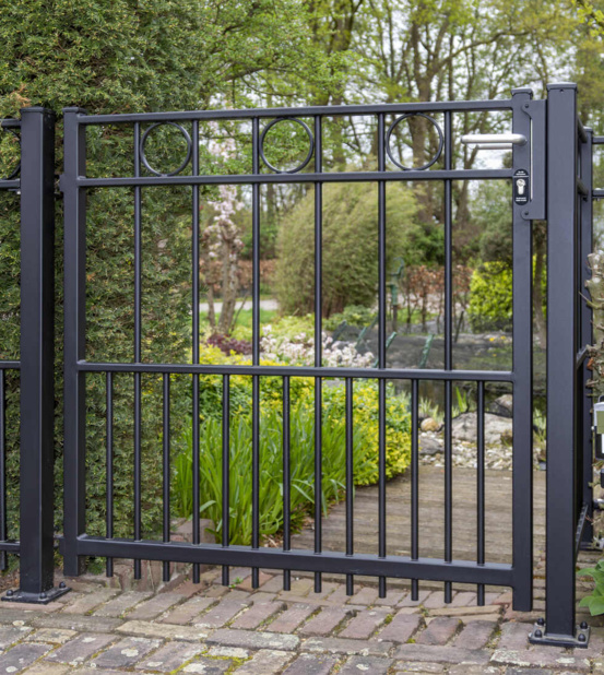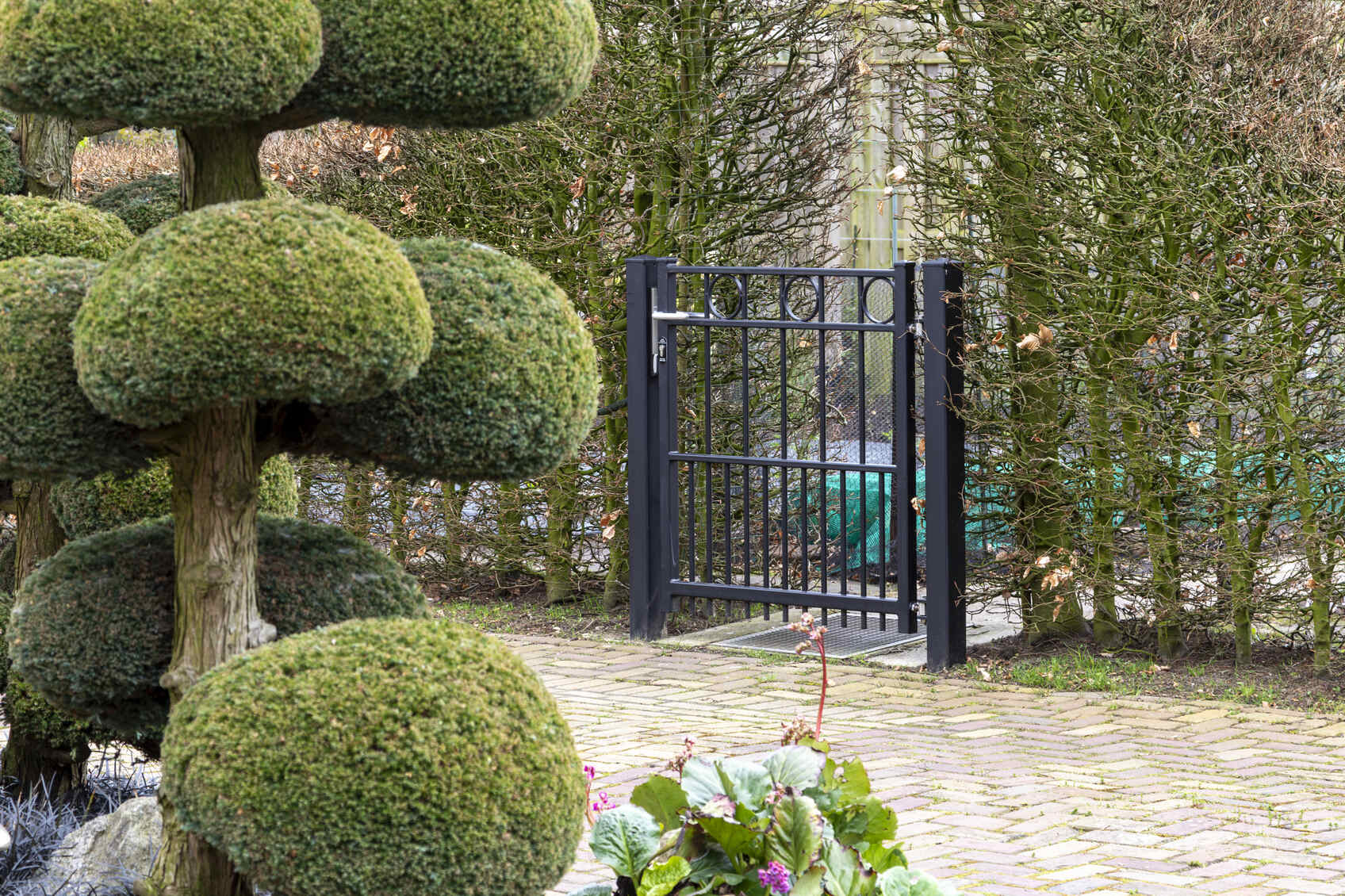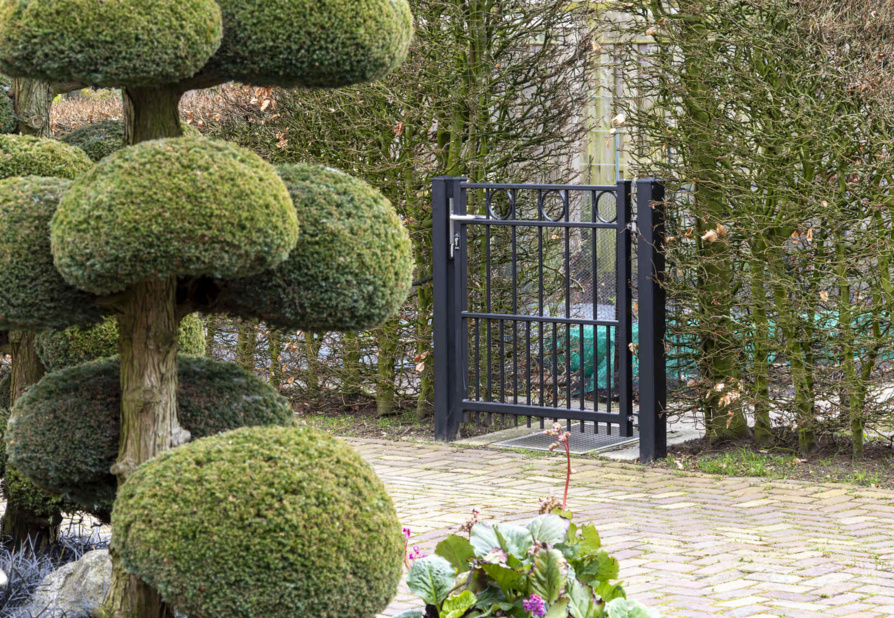 In Hoogland hebben we een klassieke elektrische railpoort geplaatst, in combinatie met 3 enkele sierpoorten en bijpassend sierhekwerk. Tussen de twee bovenliggers is om en om een ring gelast. Een sierpoort is voorzien van een hoogwaardige RVS deurdranger, zodat de poort automatisch sluit.