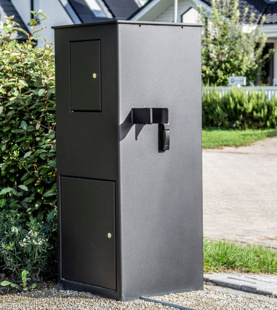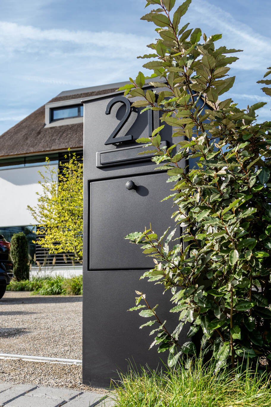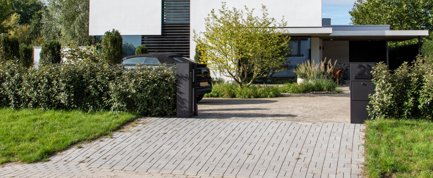 In Rotterdam staat het strakke poortmodel Londen perfect op z'n plek. Dankzij de moderne look past de poort uitstekend bij de royale villa. De XXL poortpalen zijn uitgevoerd met (pakket)brievenbus en exclusieve huisnummers.
