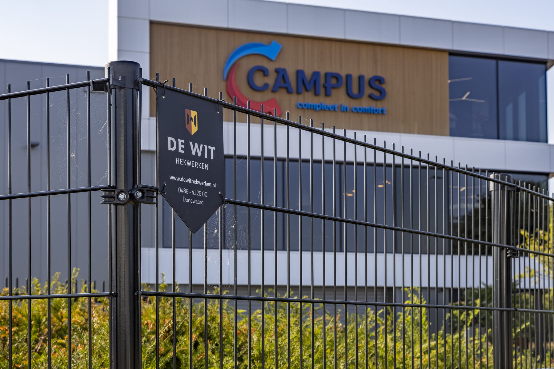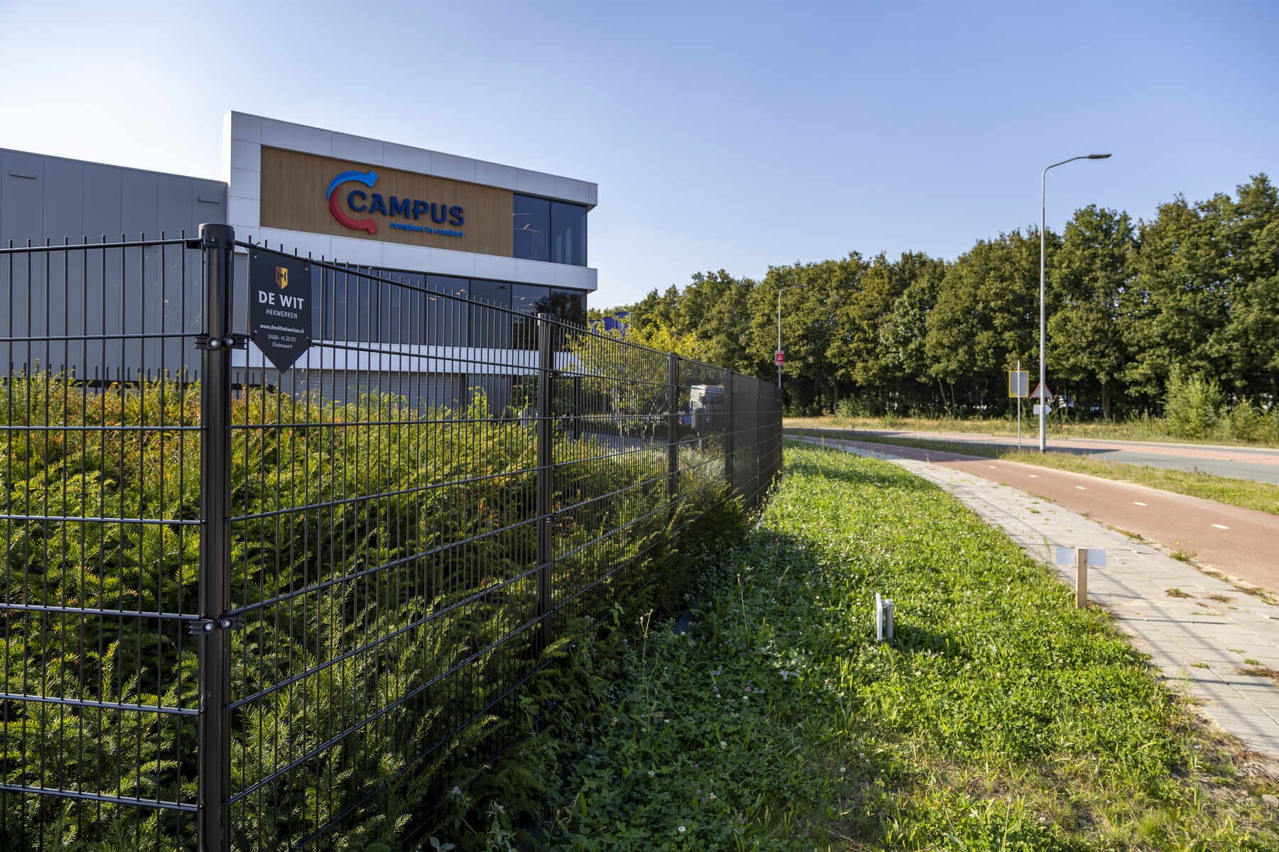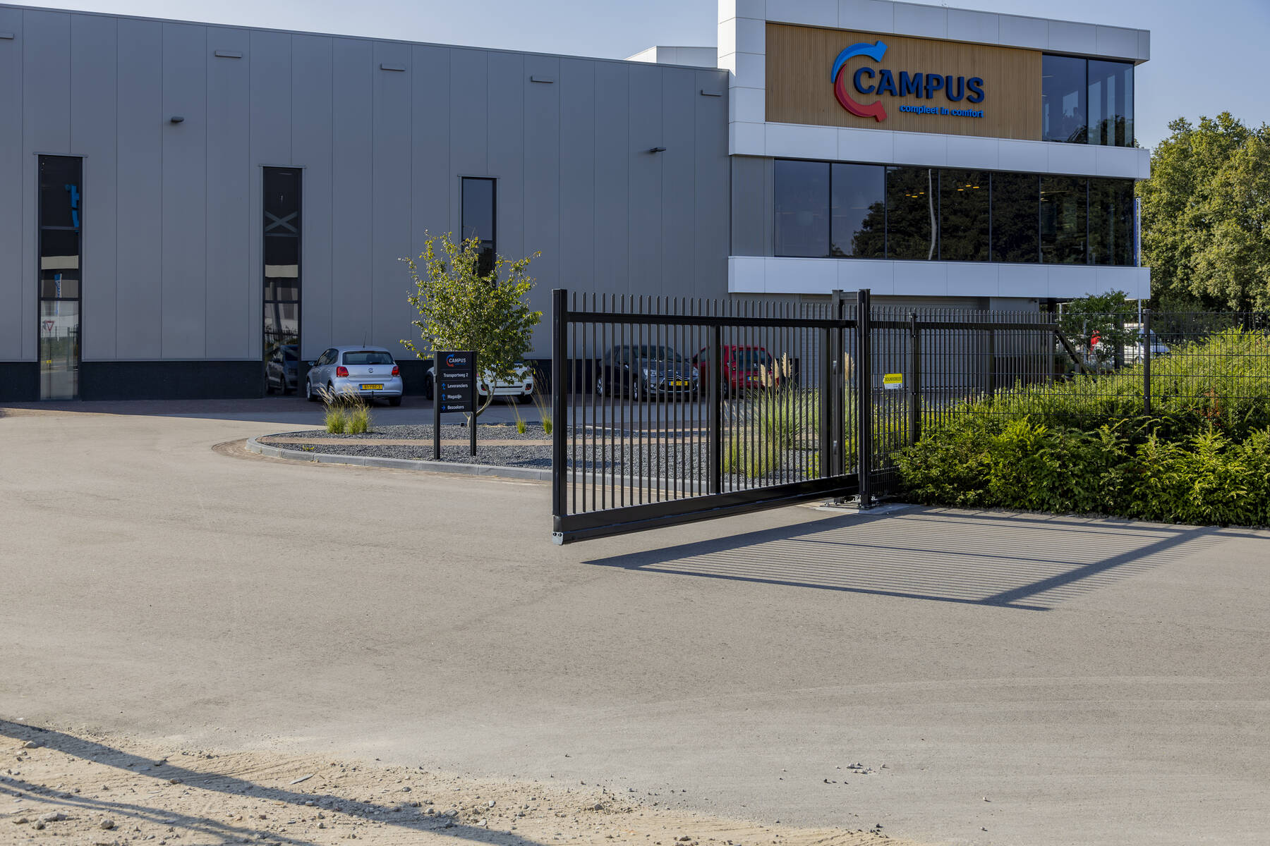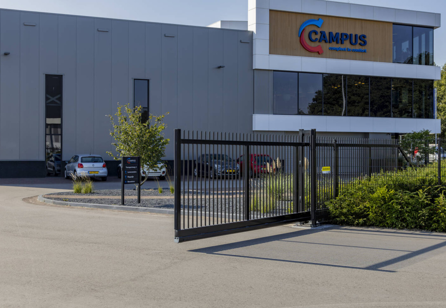 Voor het prachtige nieuwe pand van Campus Installatietechniek in Barneveld mochten wij een vrijdragende schuifpoort en dubbelstaafmat hekwerk plaatsen. De schuifpoort heeft een doorgang van 9,5 meter en wordt elektrisch aangedreven.