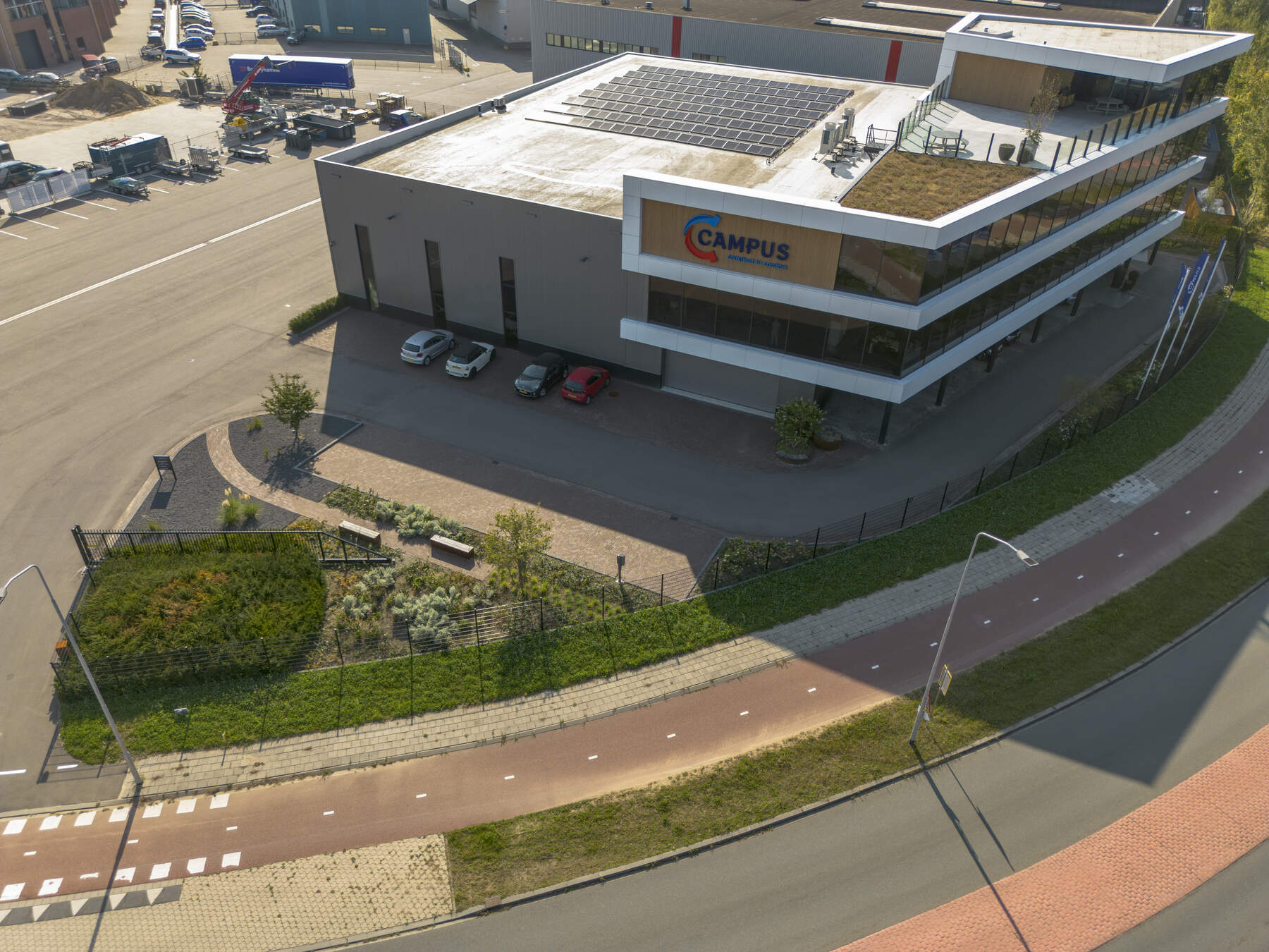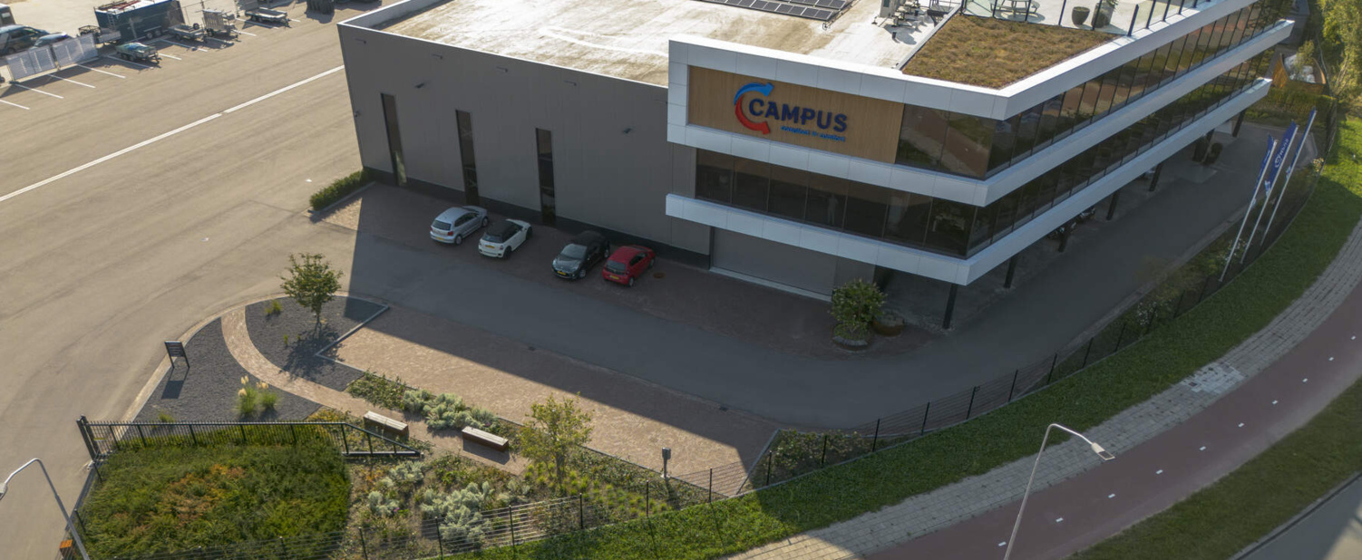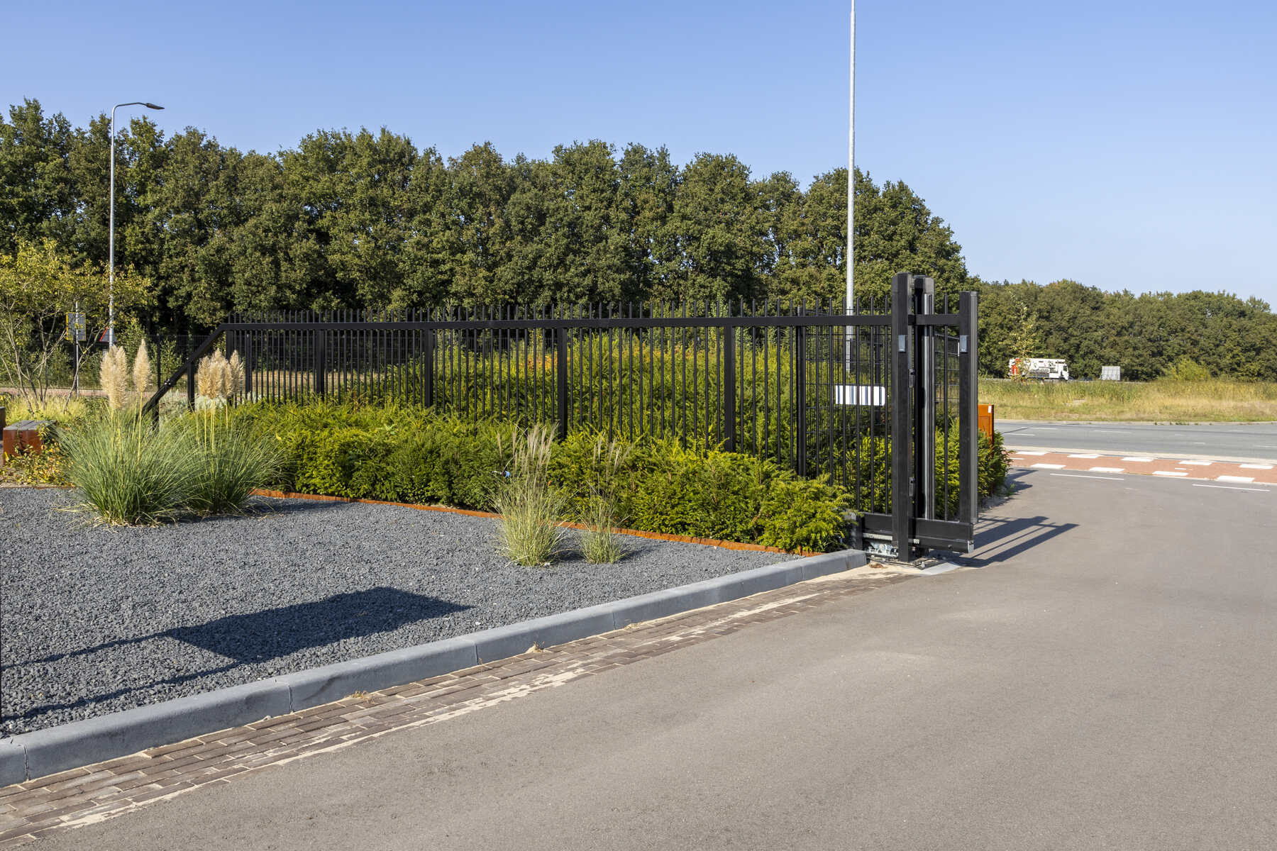 Voor het prachtige nieuwe pand van Campus Installatietechniek in Barneveld mochten wij een vrijdragende schuifpoort en dubbelstaafmat hekwerk plaatsen. De schuifpoort heeft een doorgang van 9,5 meter en wordt elektrisch aangedreven.