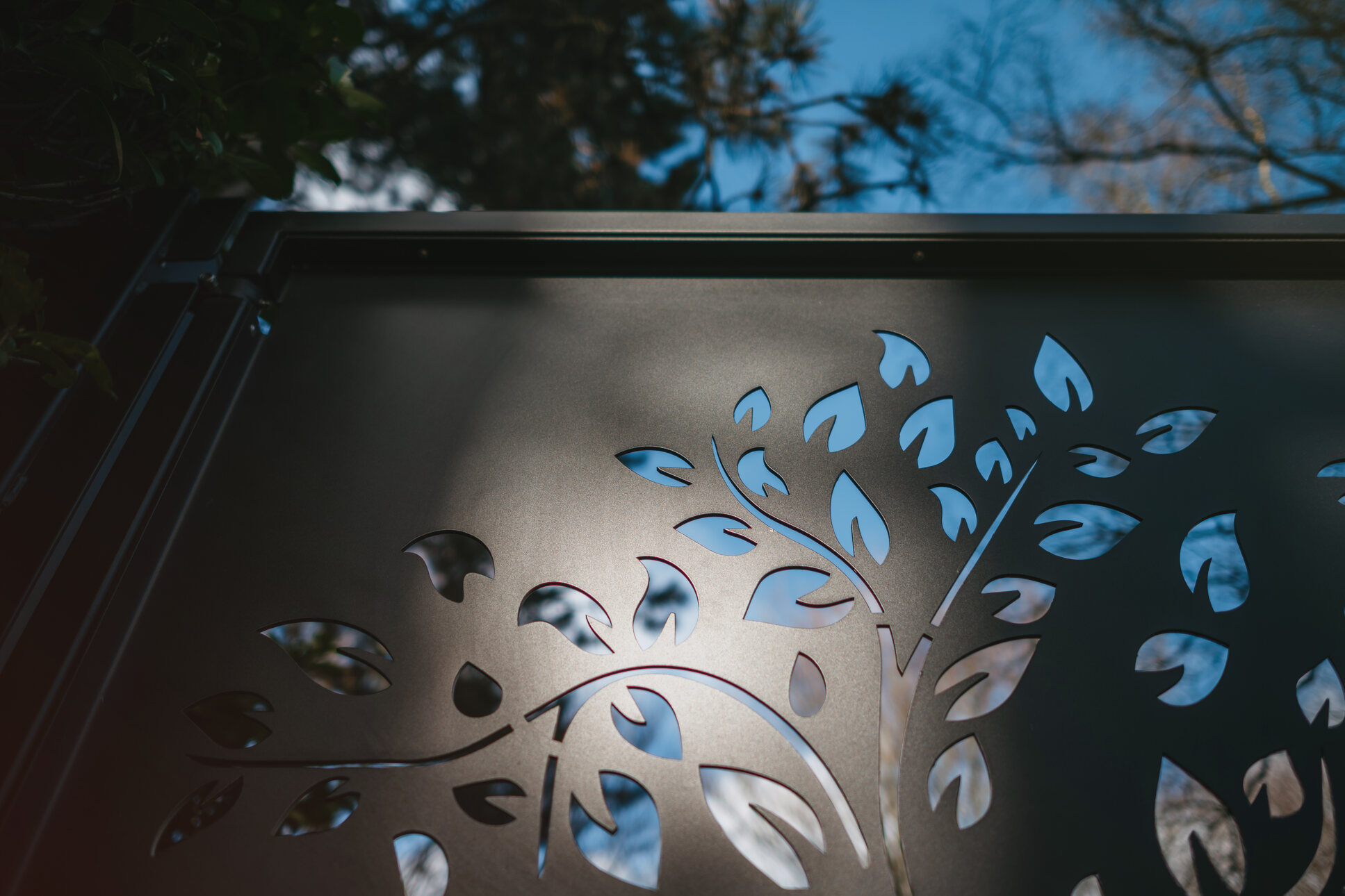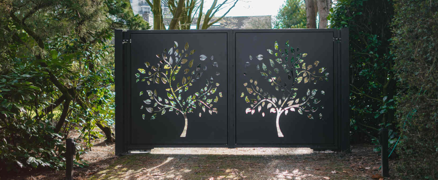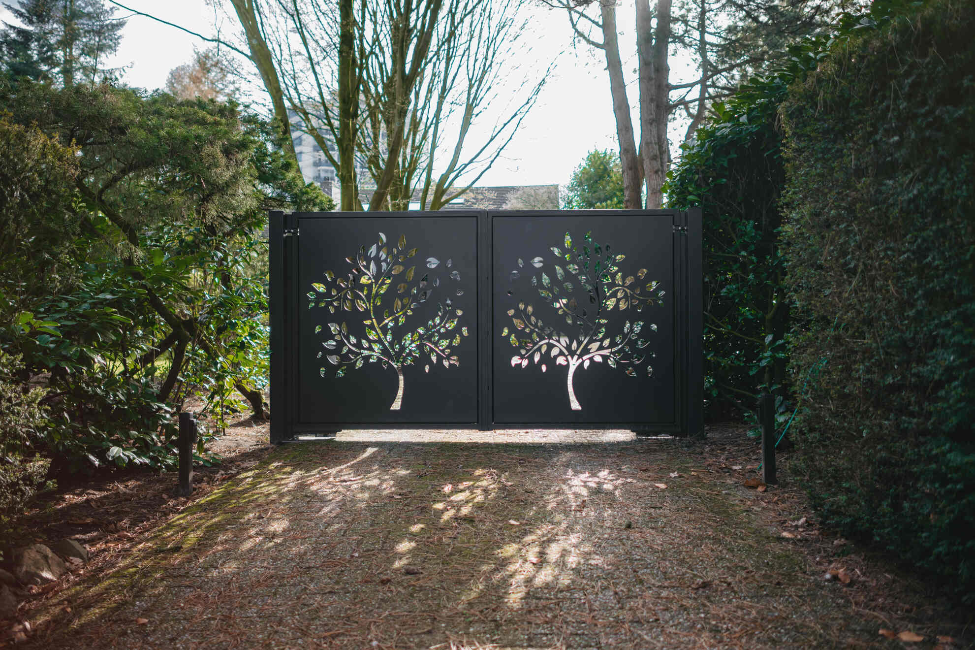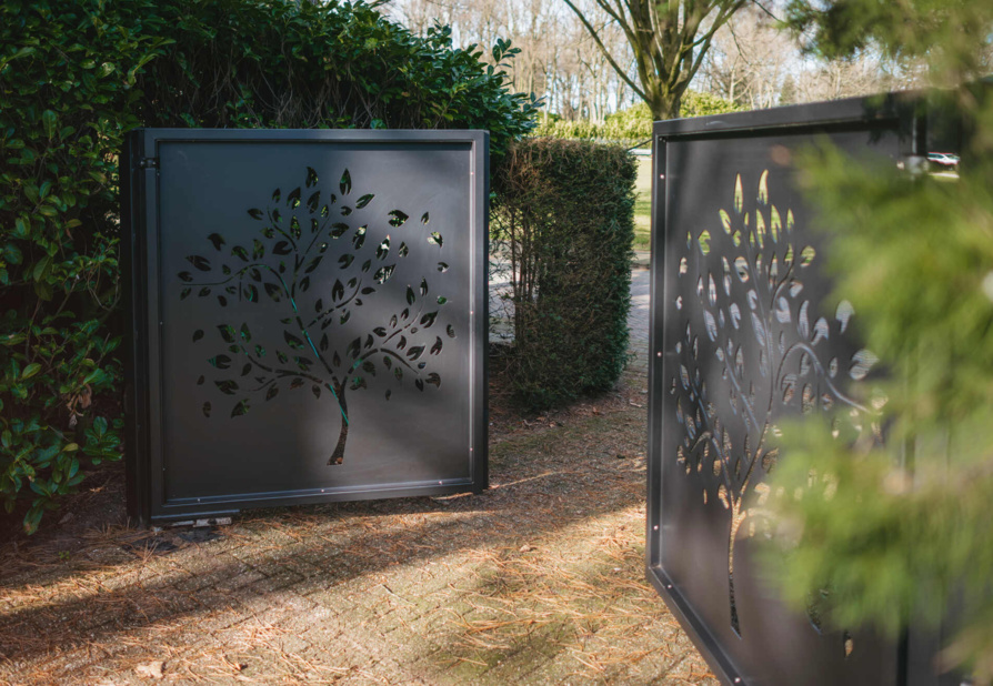 De sierhekwerk poort is voorzien van een frame van koker 50×50 mm. In het frame een aluminium plaat die op maat wordt gelaserd door een lasermachine. De plaat wordt voorzien van het boom patroon. De poort kan in alle breedtes worden toegepast.
