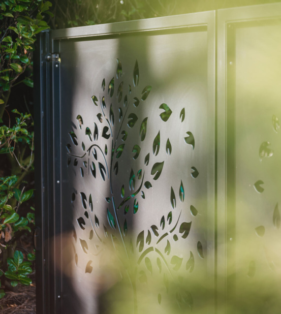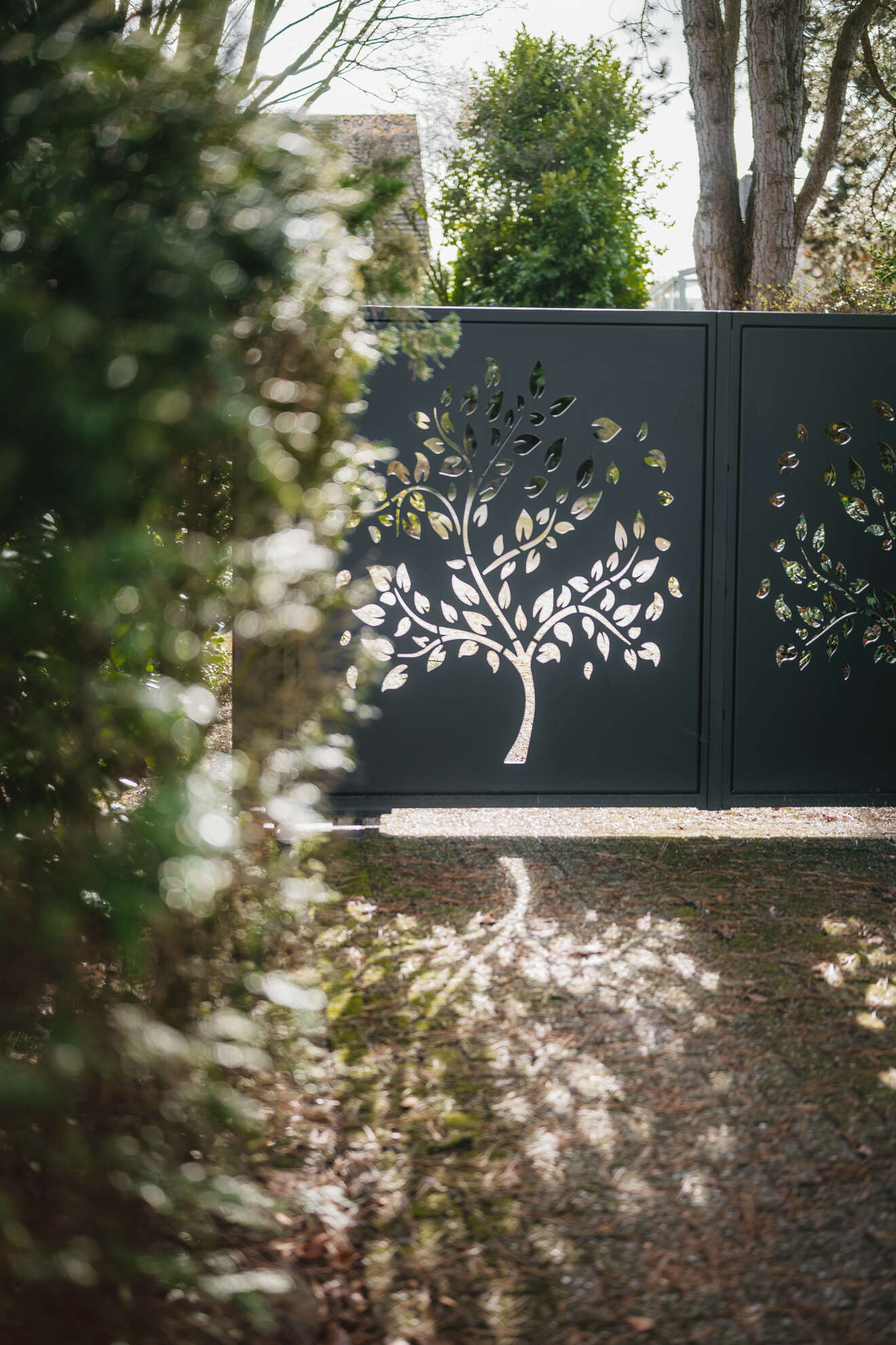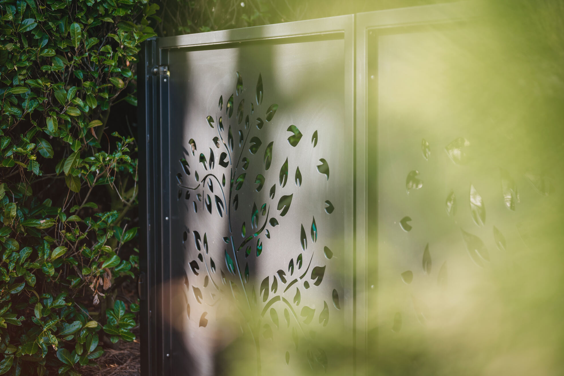De sierhekwerk poort is voorzien van een frame van koker 50×50 mm. In het frame een aluminium plaat die op maat wordt gelaserd door een lasermachine. De plaat wordt voorzien van het boom patroon. De poort kan in alle breedtes worden toegepast.