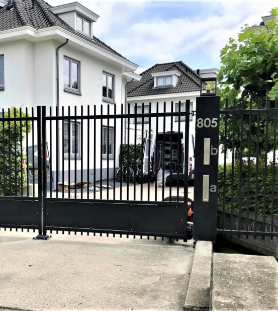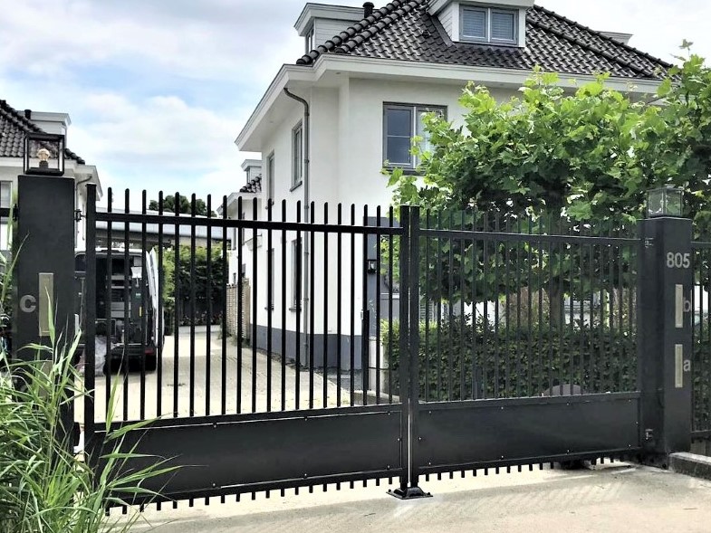 De toegangspoort model Riga heeft een geheel eigen uitstraling door de combinatie van een gladde schopplaat en verticale spijlen. De poort past in vrijwel iedere omgeving en kan mooi gecombineerd worden met een haag of hekwerk model Orion.