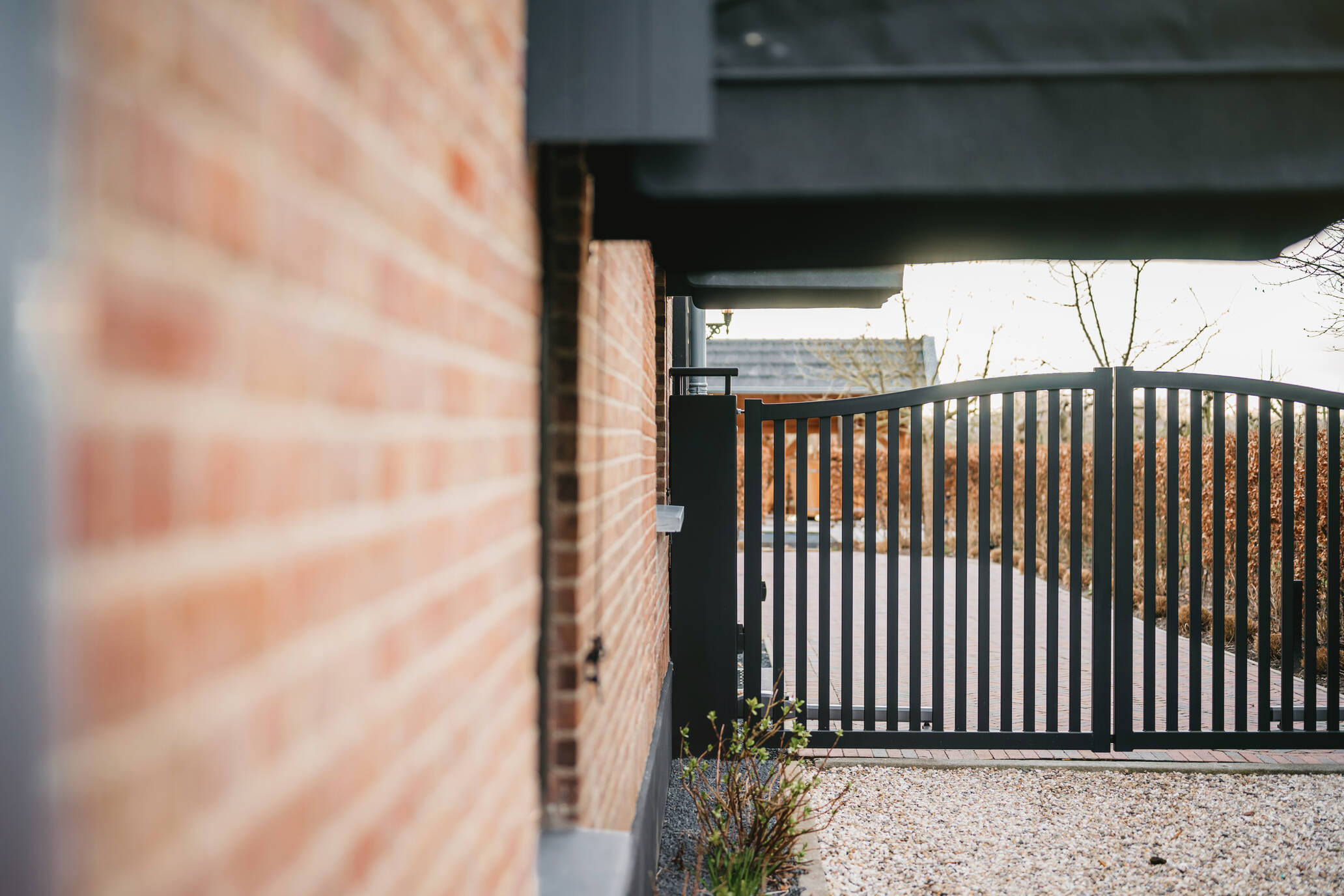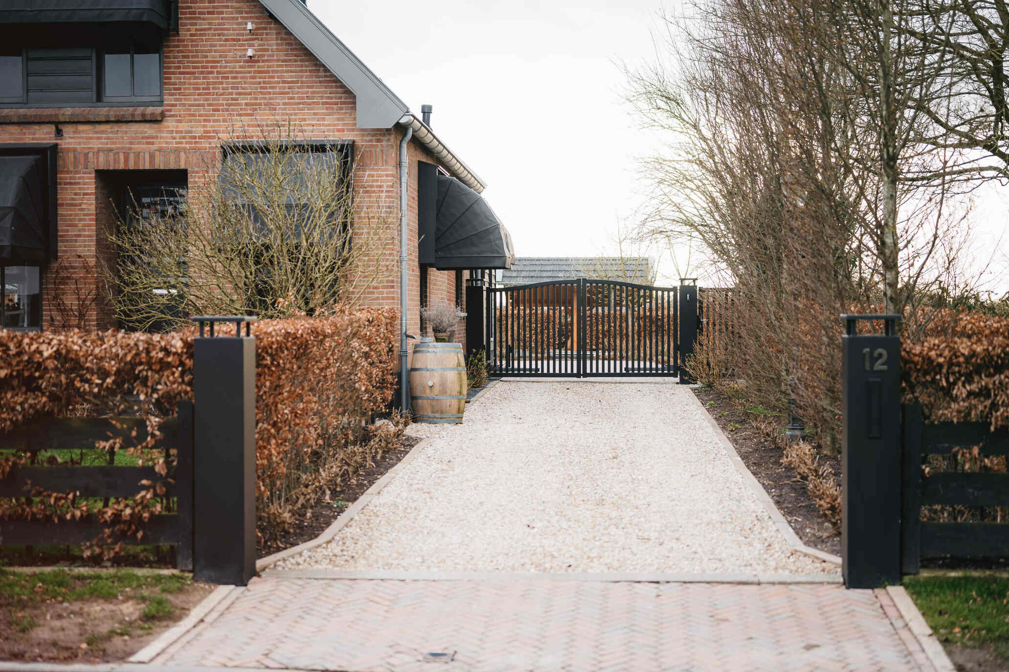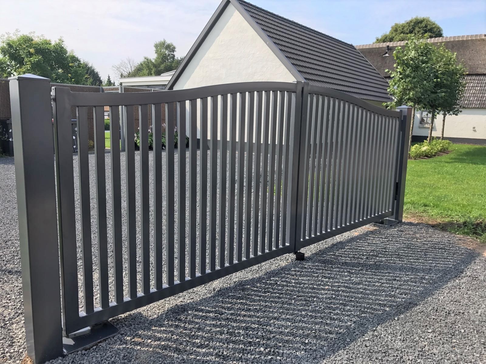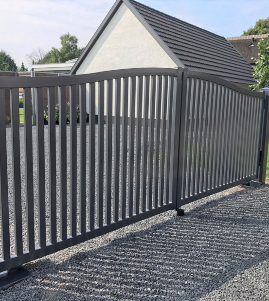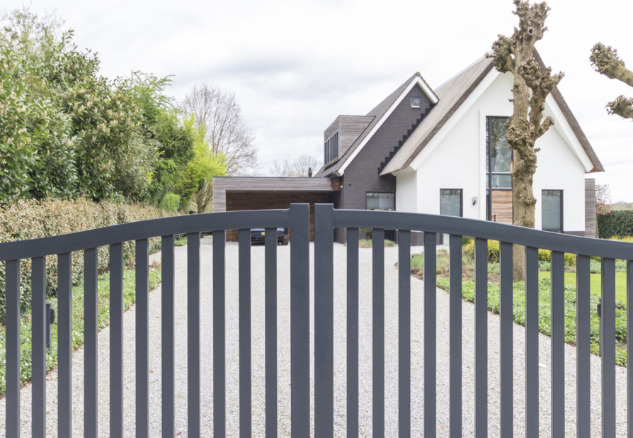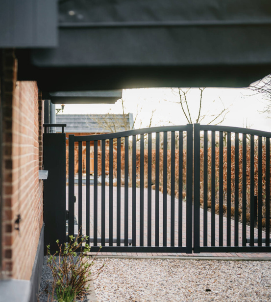 De poort wordt gemonteerd tussen robuuste, dikwandige palen. De palen worden ter plaatse in een betonfundatie gestort. Het is ook mogelijk om de poort tussen poeren te monteren. Dit is een ideal hekwerk voor een grote poort oprit.