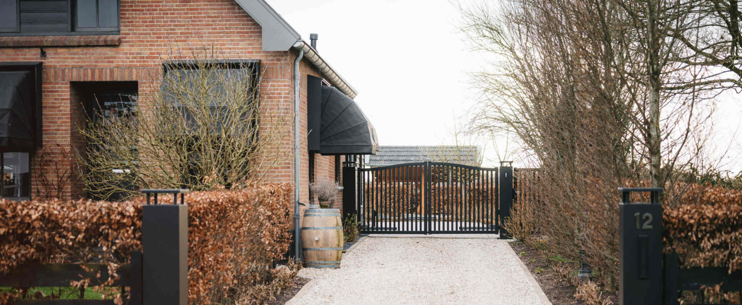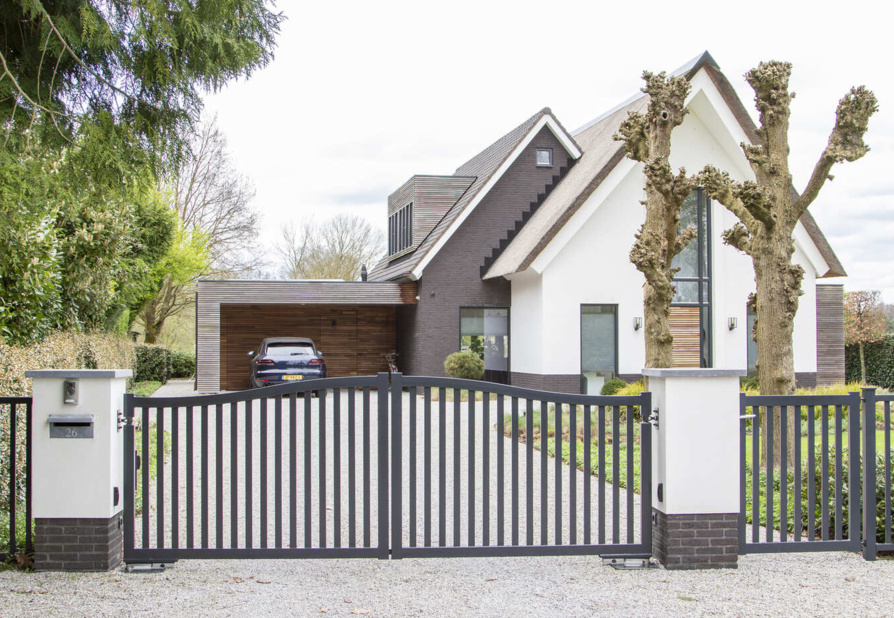 Deze stijlvolle toegangspoort heeft een kenmerkende gewalste bovenligger van maar liefst 80 mm hoog. Door deze unieke eigenschap onderscheid de toegangspoort model San-Marino zich van de andere poort modellen.